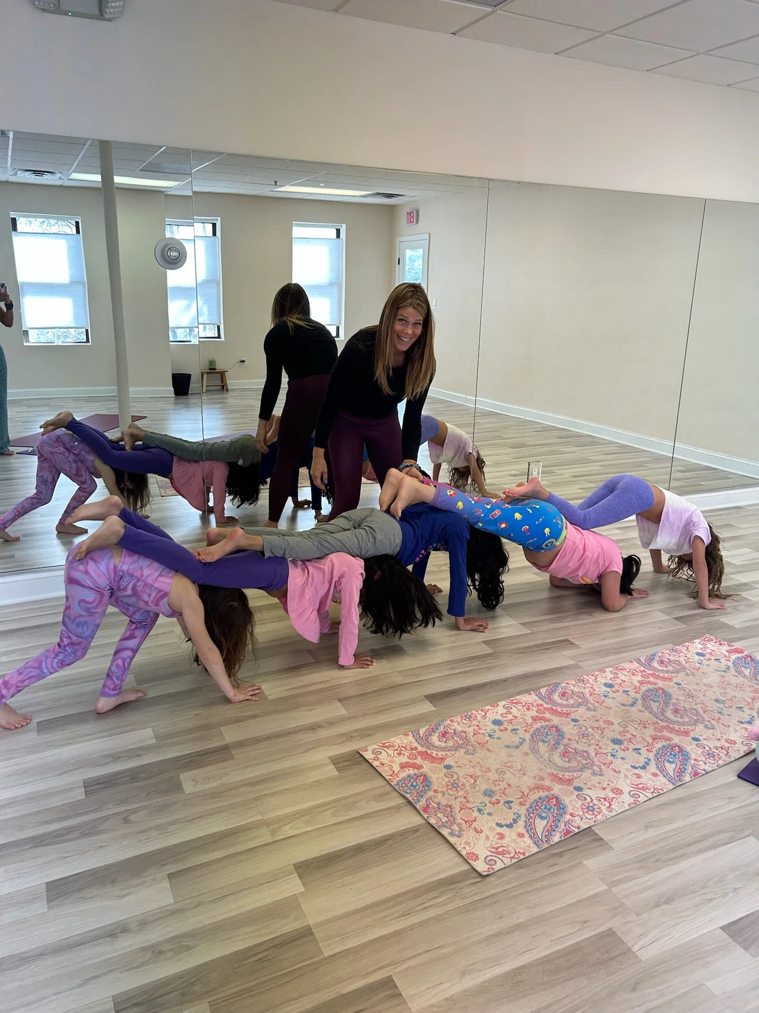 Women practicing yoga in a studio with children balanced on their backs, forming a pyramid shape in a yoga pose.